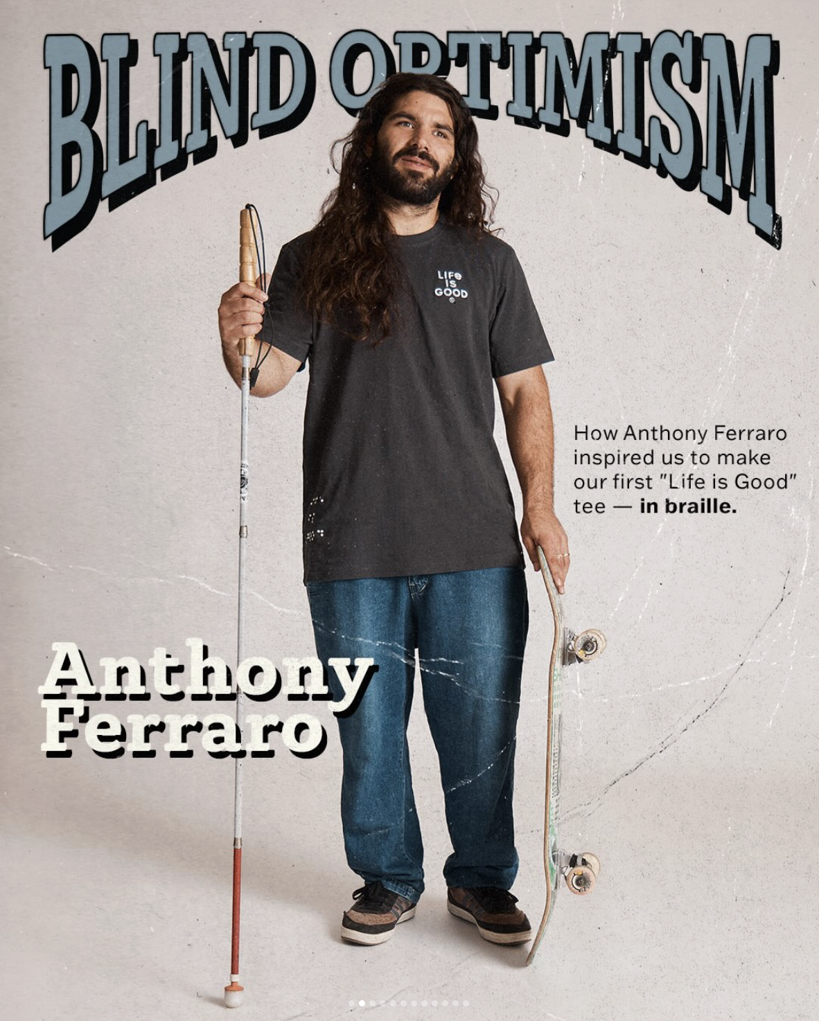 This campaign started as a concept exploration initiated by the Life is Good marketing team around a Braille-embroidered “Life is Good” t-shirt in collaboration with legally blind influencer Anthony Ferraro. I helped shape and develop the idea, then led the translation of that vision into a functional, production-ready embroidered product.