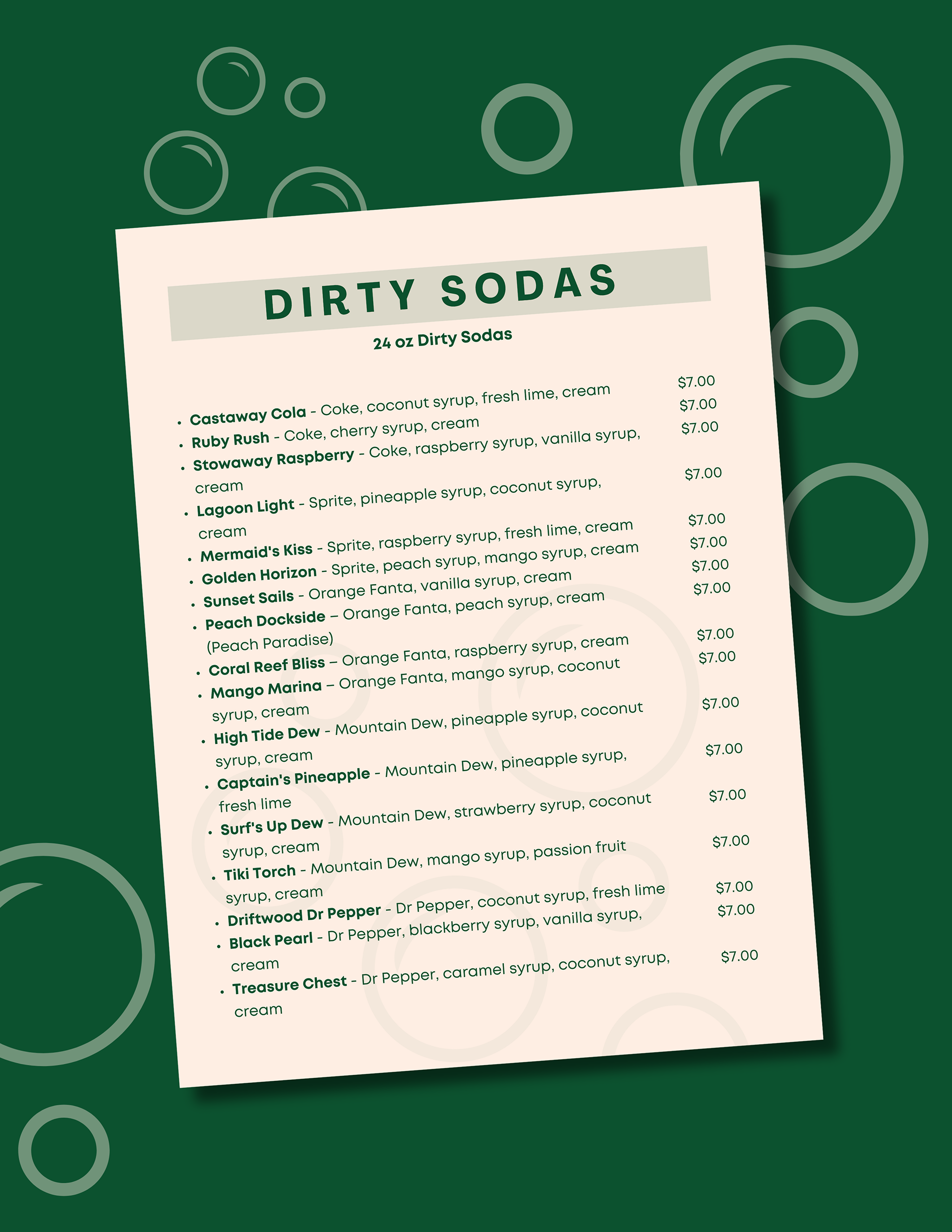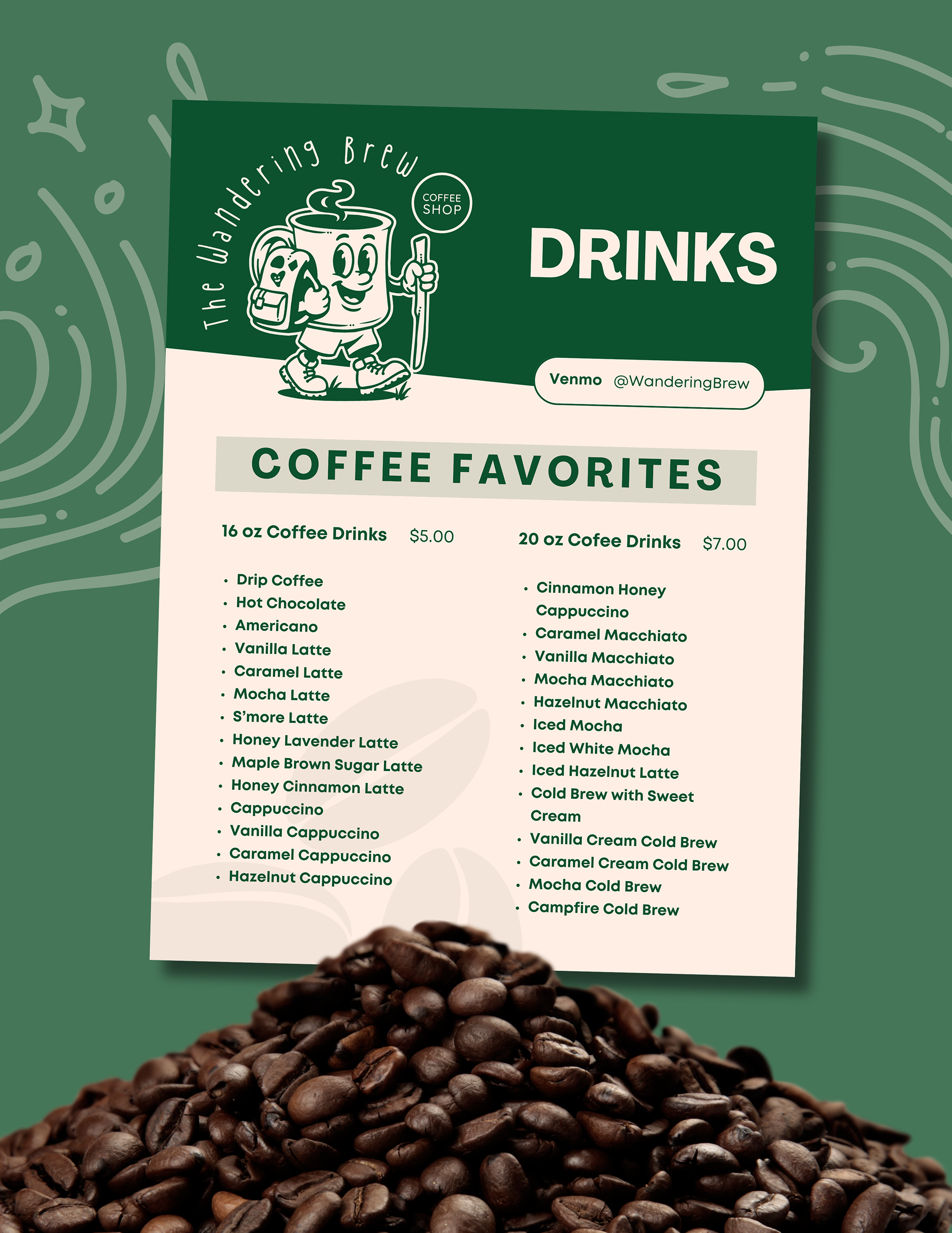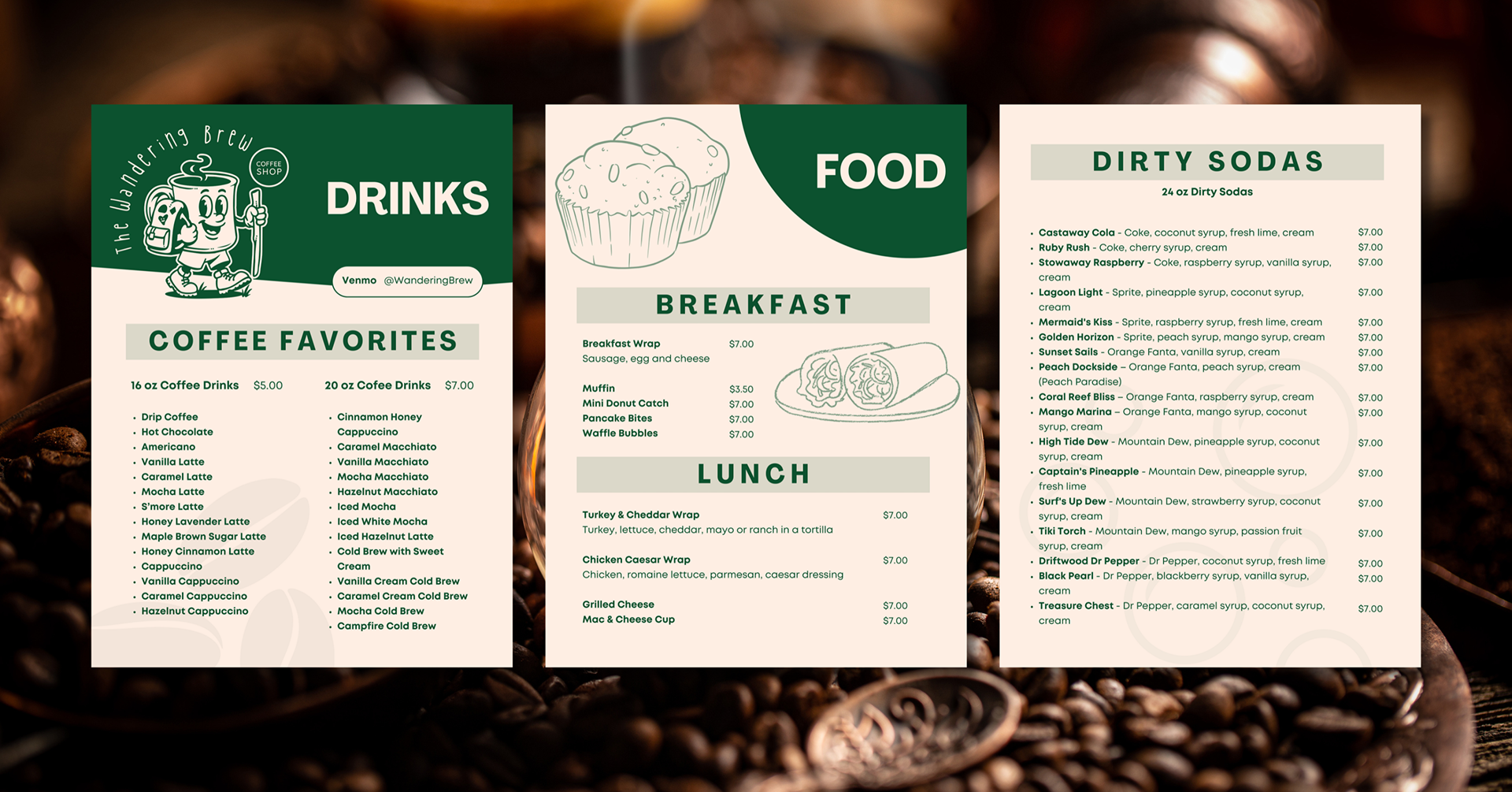 The design pulls directly from the brand identity, blending the adventurous, hand-drawn character of the logo with warm, approachable typography and a nature-inspired color palette. The layout prioritizes clarity and flow, guiding customers from classic coffee favorites to food to specialty drinks while supporting quick decision-making during busy service moments.