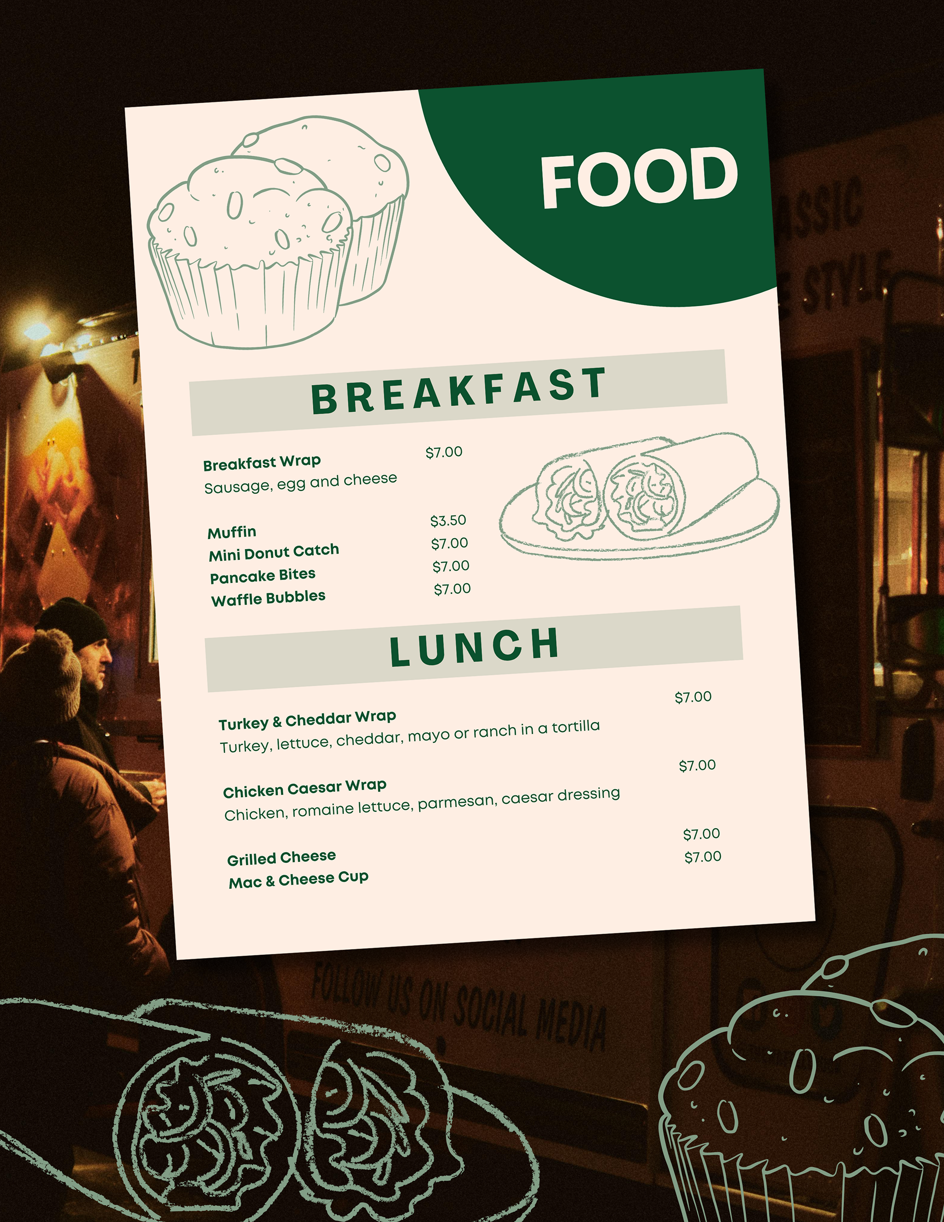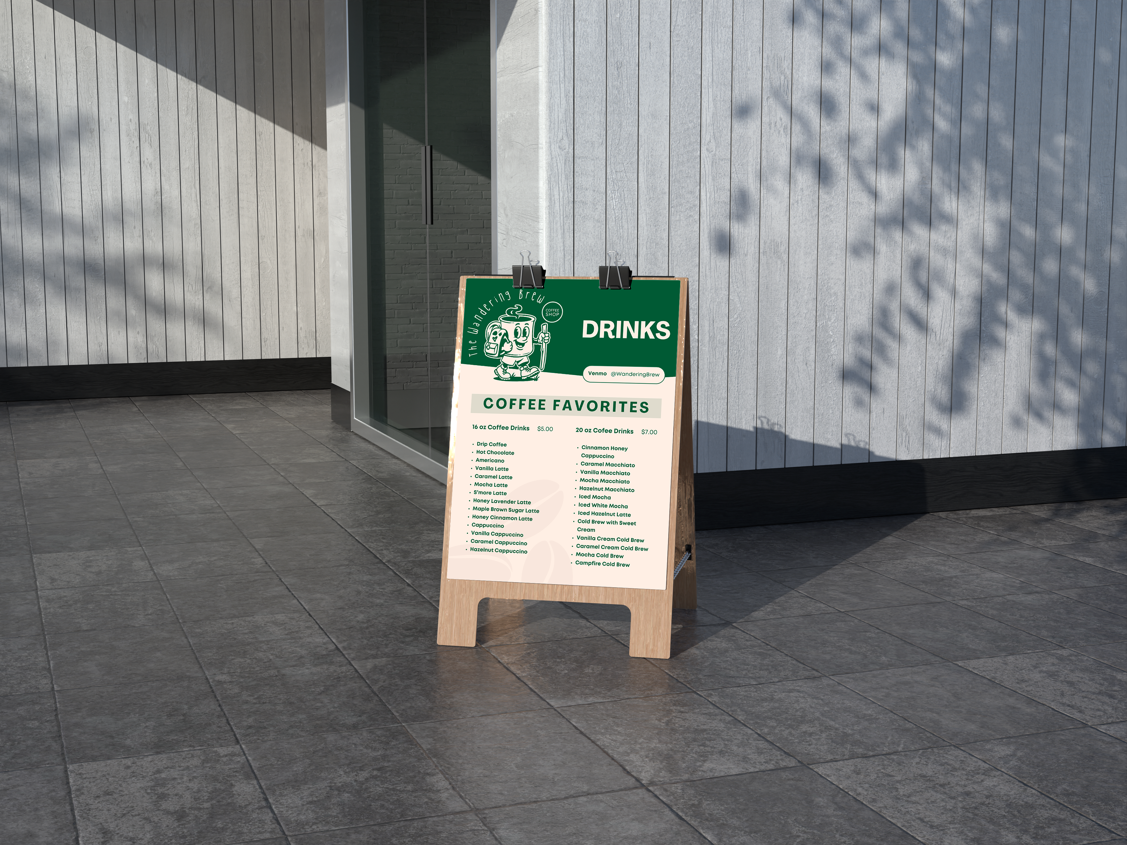Designed for a fast-paced food truck environment, the menu for The Wandering Brew needed to be clear, flexible, and easy to read outdoors. As a mobile coffee trailer, visibility and simplicity were essential. The menu had to be legible from a distance, photograph well for social media, and function seamlessly as a handheld piece.