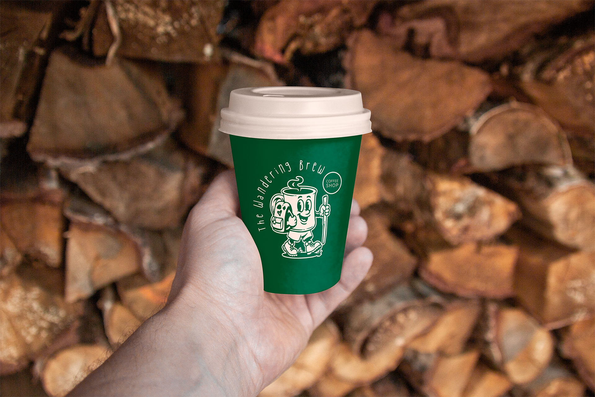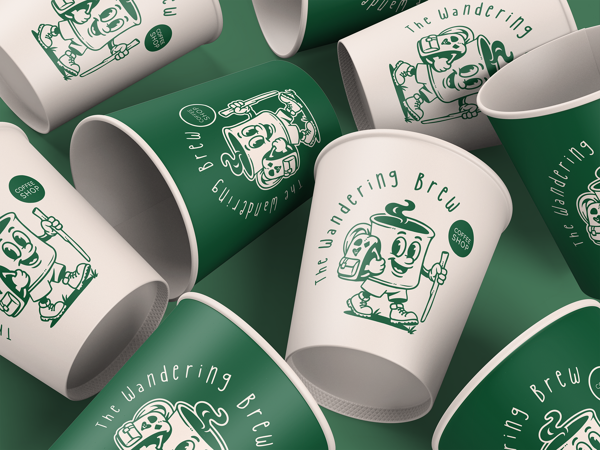 At the heart of the identity is a hand-drawn character logo: a cheerful coffee cup wearing boots and a backpack, walking with a hiking stick. This mascot brings personality, warmth, and storytelling into the brand, making The Wandering Brew feel less like a business and more like a friendly companion on the road.