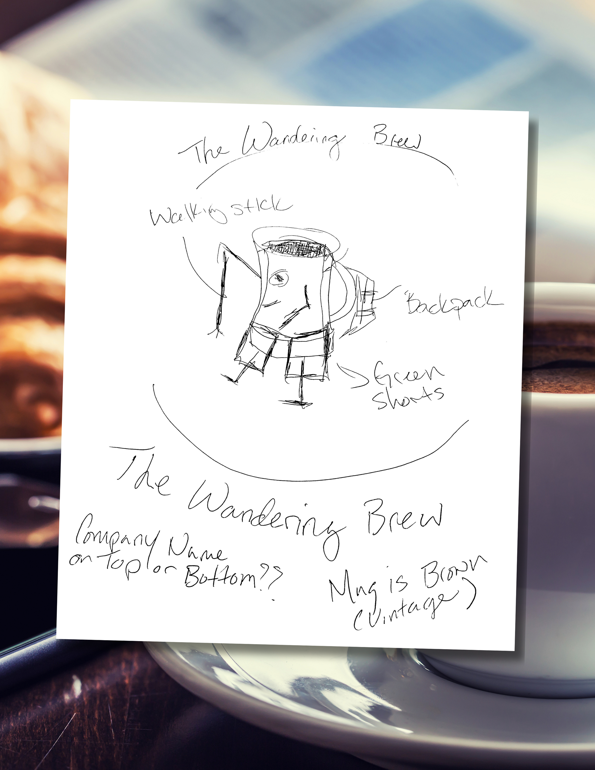 I was given a rough sketch, as well as a vision centered on a playful, character-driven mark: a coffee cup wearing shorts and boots, carrying a backpack, and walking with a hiking stick. The character reflects The Wandering Brew’s adventurous spirit - coffee meant to travel, explore, and meet people where they are.